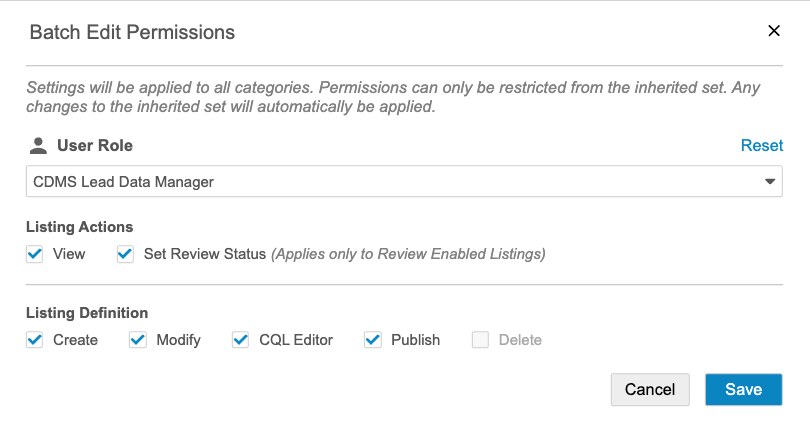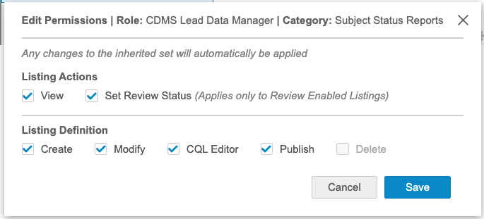 | CDMS Lead Data Manager | View, Set Review Status, Create, Modify, CQL Editor, Publish |