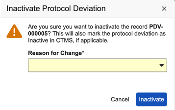 - Click Inactivate. The system updates the protocol deviation status to Inactive in EDC.