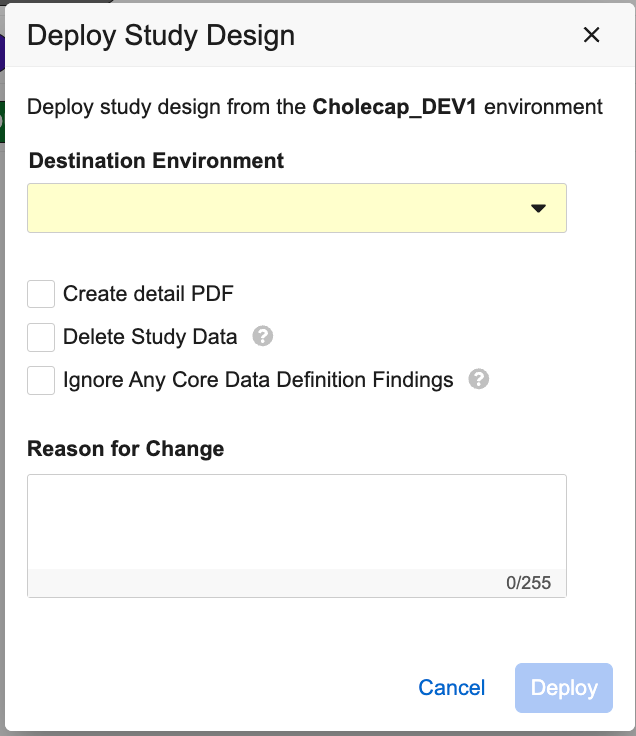 Select a Destination Environment. This is the environment that you are deploying your Study into.
