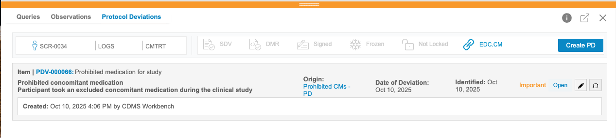 例えば、第三者機関の検査データに次のような結果が示された場合、プロトコル逸脱を記録することができます。 収集日 が EDCインフォームドコンセント日より前の場合、または第三者機関の検査値により被験者が研究から除外されるべきであると示されているが、それがEDCの I/E フォーム に反映されていない場合。