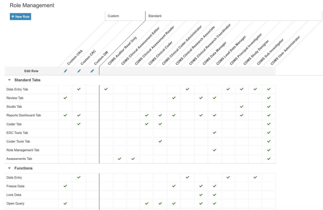 In this release, Vault only supports custom Study Roles with standard tabs and functional permissions. Custom objects and tabs are not supported in this release.