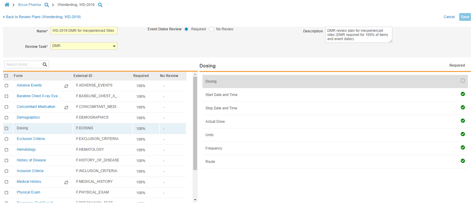 Study designers can now access a specialized Review Plan Editor from Studio > Review Plans. With the Review Plan Editor, study designers can quickly and easily create and update SDV and DMR Review Plans for their Study. Users can select a single radio button to apply the Required mode to all Event Dates in a Study. From the Review Plan Editor, users can select Forms from the Driving panel. Vault opens that Form in the Form panel, where users can select the requirement mode for each Item on the Form. As part of this feature, we renamed the Not Available requirement mode to No Review.