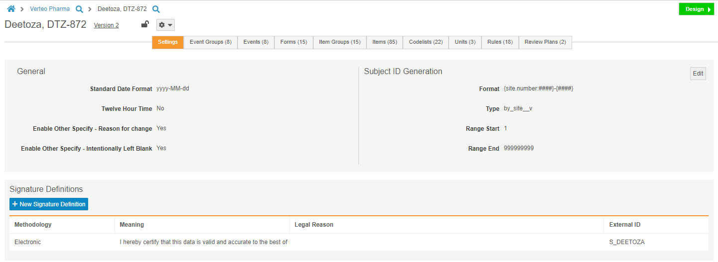 Studio users can now manage study-level settings, including Subject ID generation settings and the Signature Definition, from the new Settings subtab in Studio. Prior to this release, Admins could only change these settings by editing multiple object records from Admin > Business Admin. This enhancement allows Studio users to manage these settings easily and from a single location.