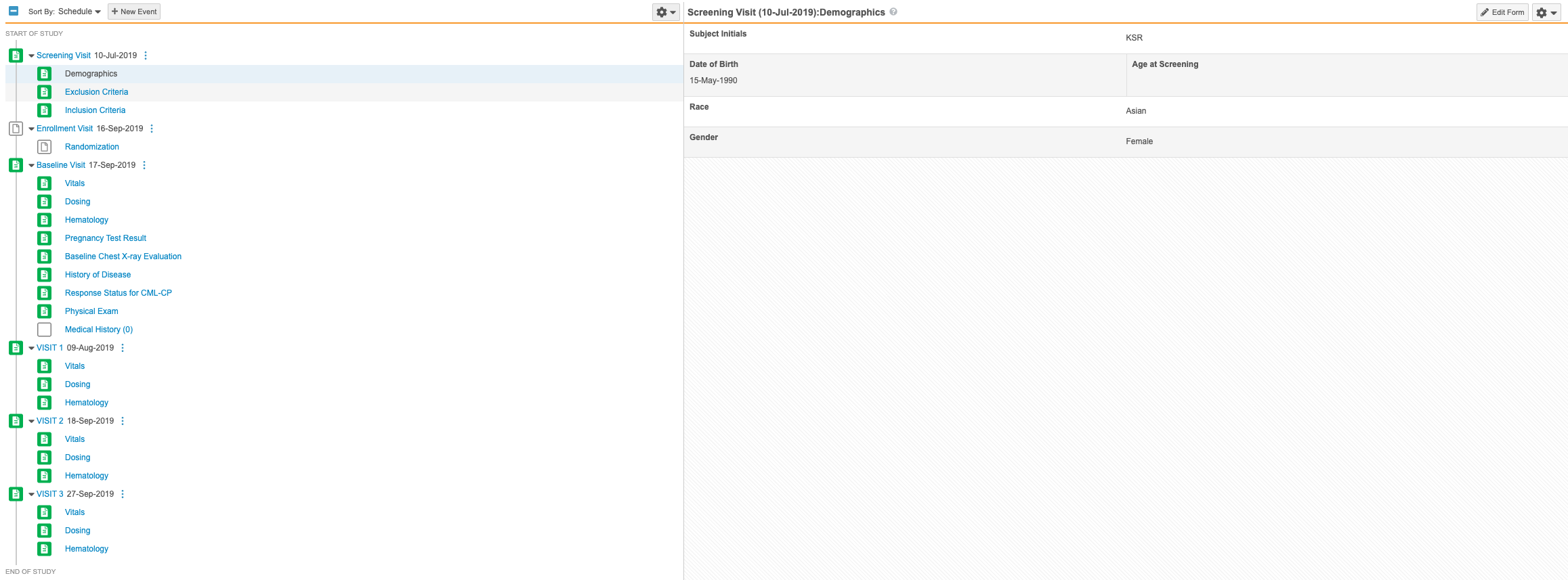 In this release, the Casebook Schedule page has been combined with the Form Display page to create a better navigational experience for the user. All Events and Forms in the Study Schedule are now displayed next to the Form panel, allowing Data Entry users to navigate to any Form within any Event. Any activities previously performed by CRAs or DMs (SDV, DMR, Freeze, Lock, etc.) will now need to be performed in the Review tab.