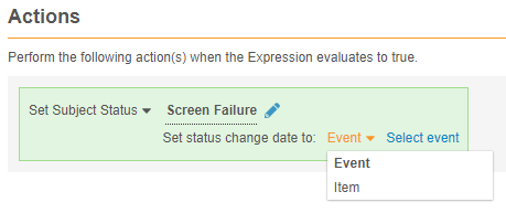 Study designers can configure a Set Subject Status rule action to set the date for the status change to an Event Date or date from a date-type Item.
