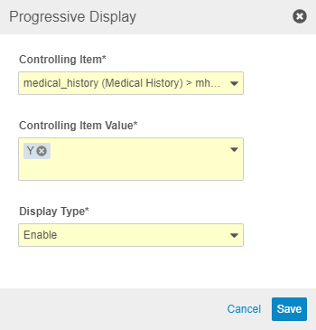 Progressive display allows for more intuitive form design to support data entry users, leading to improved data quality. For example, a form with thirty total data items can display only the relevant items for the subject an investigator is collecting data for.