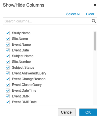 열 표시/숨기기 대화 상자에서 표시할 열을 선택할 수 있습니다.열을 숨기려면 열의 체크박스를 선택 해제합니다.모두 선택 및 지우기를 클릭하여 모든 열 체크박스를 한 번에 선택하거나 지울 수 있습니다.