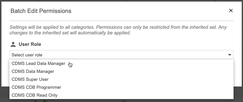 또한 단일 일괄 작업으로 모든 카테고리에 대해 스터디 역할에 동일한 권한을 할당할 수 있습니다.일괄로 모든 카테고리에 걸쳐 스터디 역할에 대한 액세스를 편집하려면: