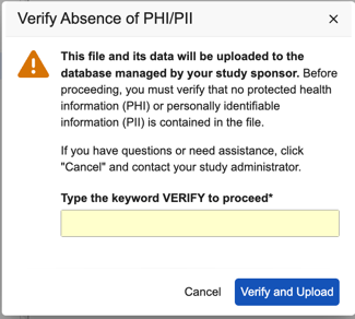 PHI/PII가 없는지 검증(Verify Absence of PHI/PII) 대화 상자에서 VERIFY를 입력하고 검증 및 업로드(Verify and Upload)를 클릭합니다.