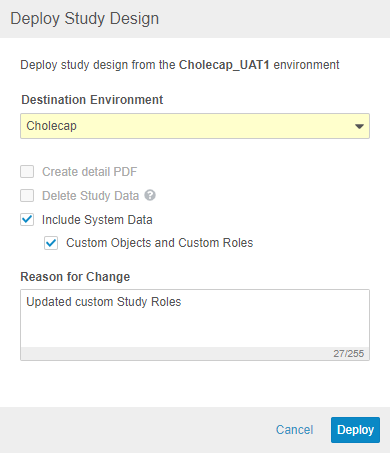 With this release, Vault supports deployment of custom Vault objects and custom Study Roles as part of study deployments. Any custom objects and custom Study Roles that are defined in the Deployment Whitelist will be included in deployments from environment to environment. To exclude a custom role from a deployment, it must be deleted from the source environment. Vault also includes these custom roles and objects when restoring an environment. To deploy a study, a user needs the CDMS Deployment Administrator or EDC Deployment Administrator study roles. In this release, we only support the ability to deploy custom vault objects and custom study roles along with a study design deployment.