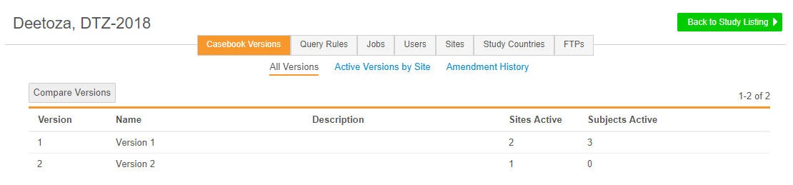 Lead data managers can now run a report to easily view the differences between two Casebook Definition versions within EDC Tools > Casebook Versions > All Versions. They can also choose to compare two versions across two different Studies or vaults. This comparison report is the same comparison report that is available with the Compare Versions action in Studio.