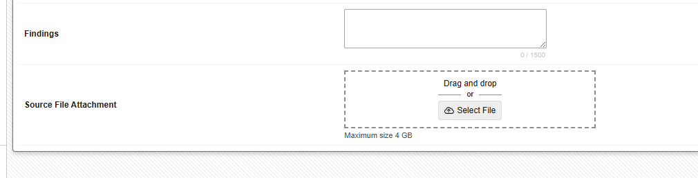Site users can upload files of up to 4 GB in size to configured File Attachment items from their computer using either a simple file selector or by dragging and dropping the file directly into the form.