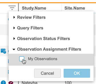 - 从排序和筛选(Sort & Filter)菜单中,单击观察任务筛选器(Observation Assignment Filters)以展开该部分。