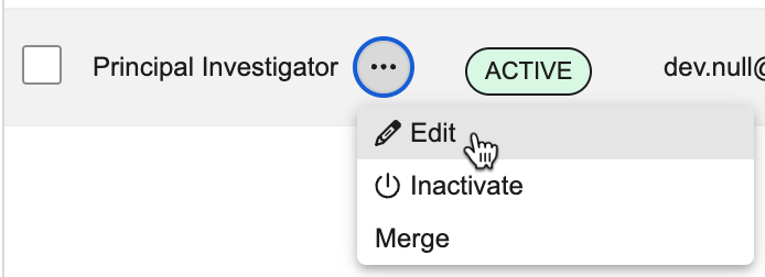 停用 PI 会使该记录在选择 PI 时不可用。但是,系统不会自动更新引用该已停用 PI 的现有研究中心。停用也不会影响该用户或其研究访问权限。必须单独更新用户帐户。