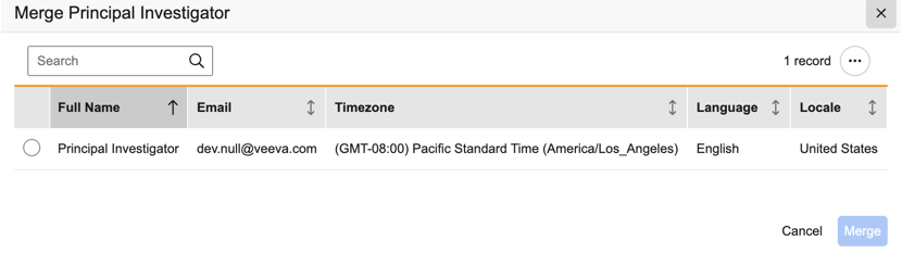 - 在合并主要研究者(Merge Principal Investigator)对话框中,搜索并选择要保留的目标 PI 记录。