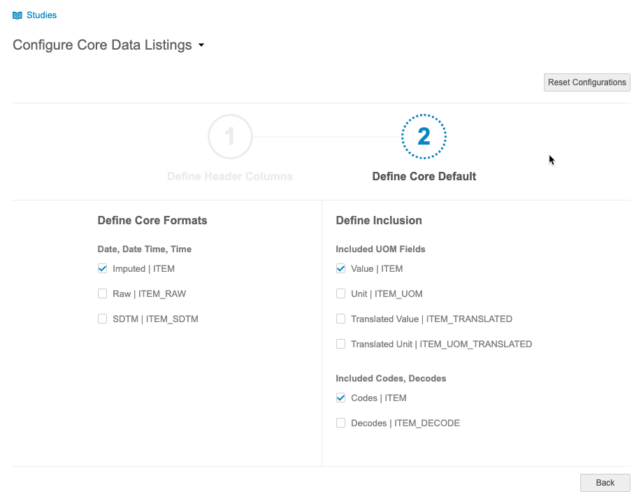 Administrators can now configure Core Listings. This configuration includes the ability to select which study attributes to include and which formats to use, such as always using raw format for datetimes or always including Translated Value and Translated UOM. Configuration is subject to a review and approval process.
