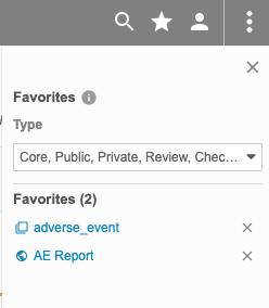 With this release, CDB users can mark listings, checks, and views as Favorites. They can manage their favorites from the Favorites panel, which is accessible via the Favorites () button in the top navigation menu.