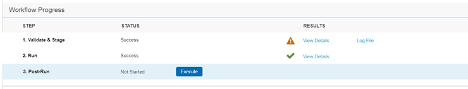 This release introduces a new design to make the workflow more intuitive and the UI more user-friendly. This feature focuses on the design of existing load workflow steps: Validate & Stage, Run, and Post-Run. Part of this design is the Workflow Progress table. This table does the following:
