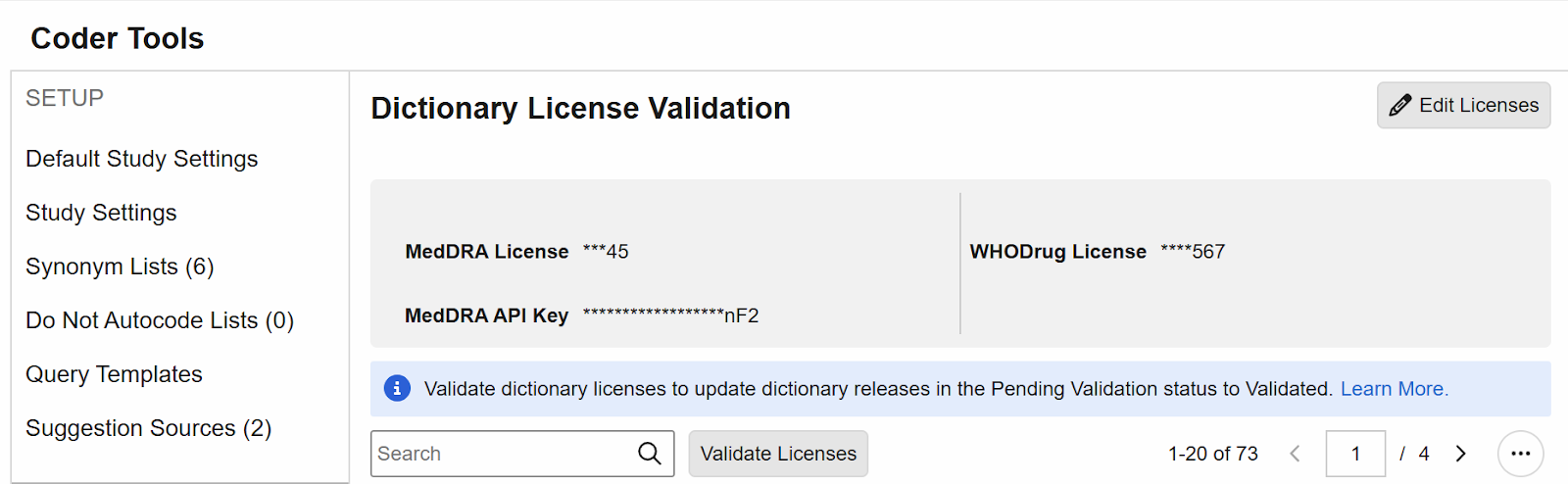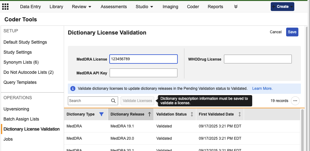 A new sub-tab in Coder Tools has been added for Dictionary License Validation. Coder Administrators and custom roles with the Manage Coder Study Settings permission have the ability to Edit License and API Key values and then subsequently Validate the information.