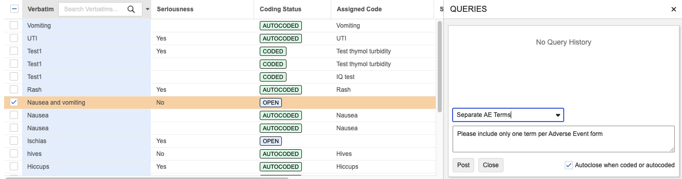 When issuing a query for a verbatim, Coders can use the searchable drop down menu to select from available templates for that form type.