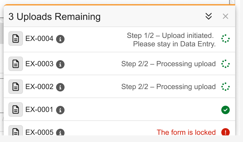 • Step 1/2 – Upload initiated. Please stay in Data Entry.
