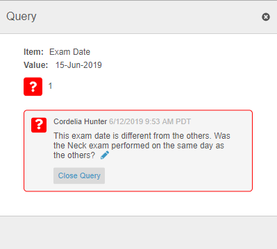 For repeating Item Groups in tabular view, Vault now shows the Open Query and Answered Query icons in the Item value’s table cell. If there are multiple queries with different statuses on the same Item, Vault displays the Open Query icon before the Answered Query icon. Once a user clicks on the query icon, Vault displays all queries on the Item in the new Query dialog, where users can answer queries.