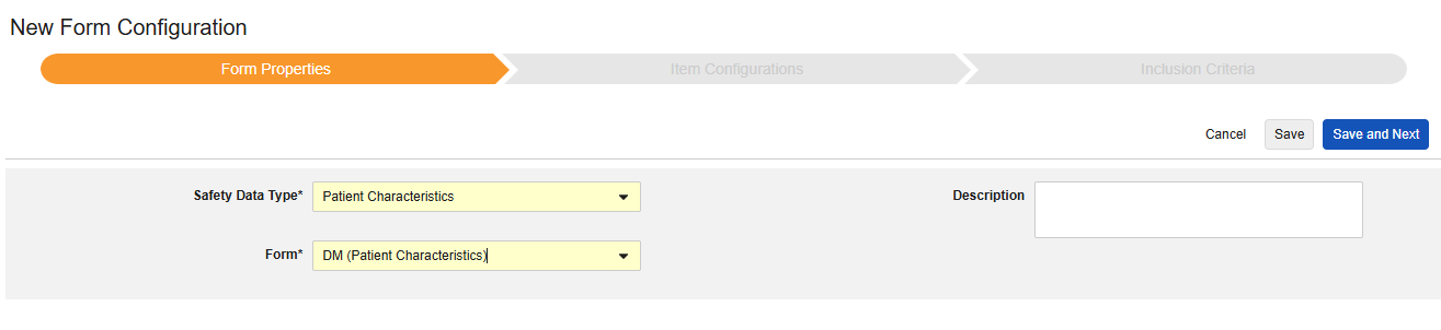 The options for Form Properties, Item Configurations, and Inclusion Criteria are described in detail in the later sections of this documentation by safety type.